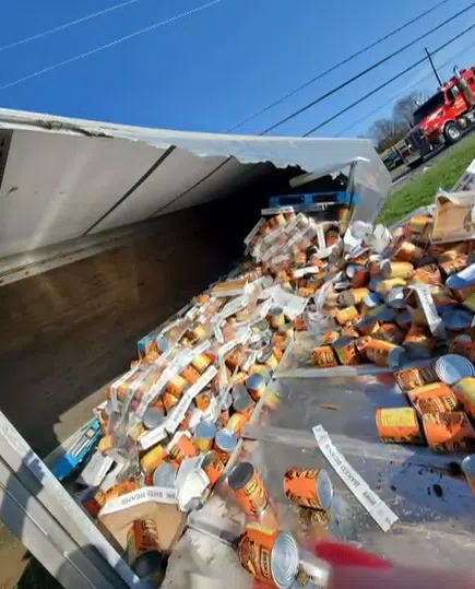 Authorities say a semi-truck overturned on Newport Highway, spilling thousands of cans of Bush’s Baked Beans into the road and someone’s yard.