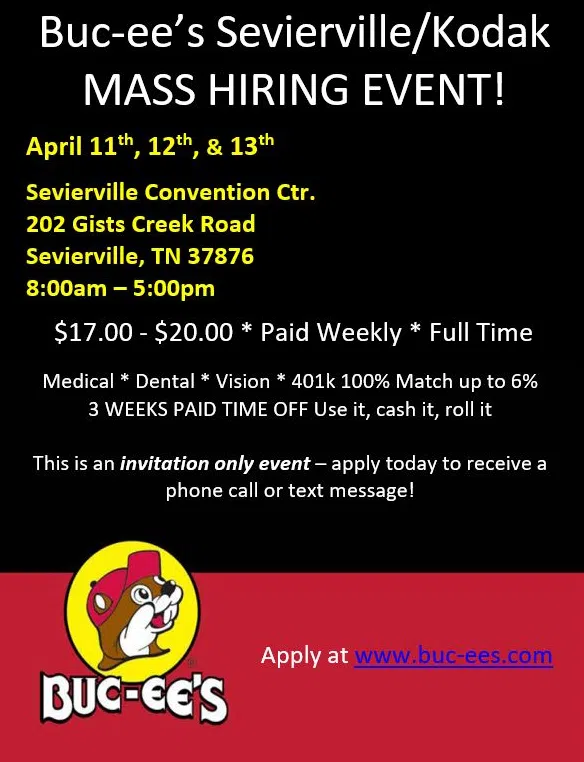 The event will be at the Sevierville Convention Center on Gist Creek Road and is invitation-only. Please go to https://store-external-buc-ees.icims.com/jobs/8968/cashier/job?mobile=false&width=945&height=500&bga=true&needsRedirect=false&jan1offset=-300&jun1offset=-240 for your link to apply.