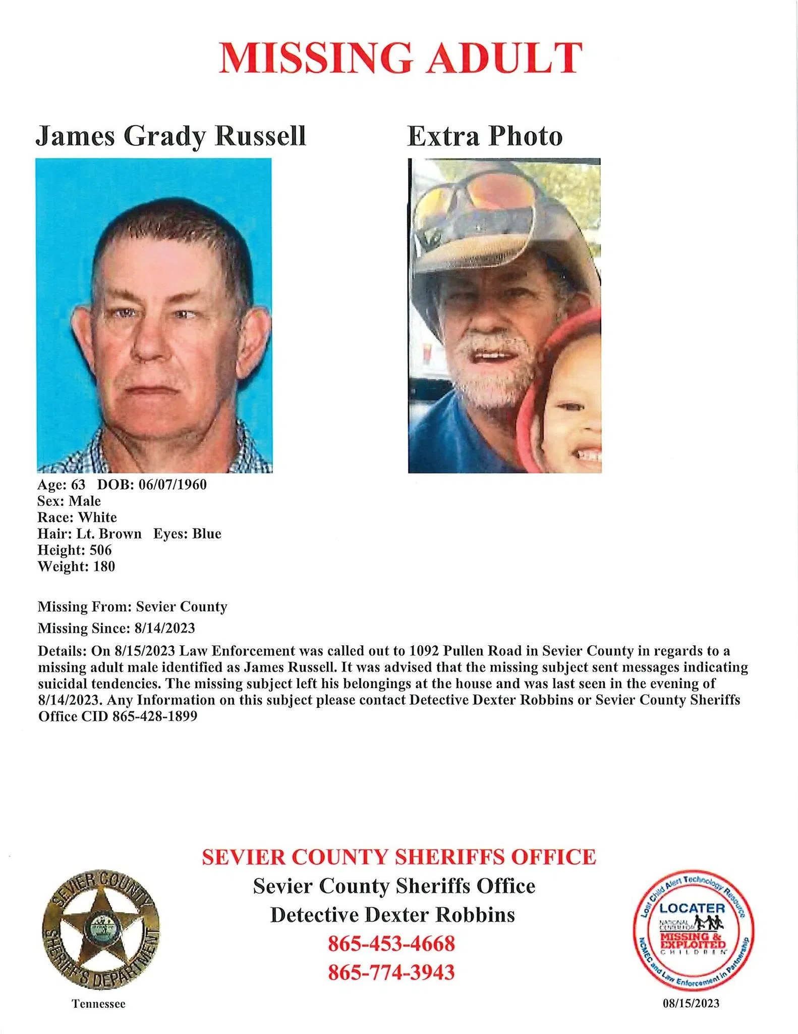 Anyone with information on Russell’s whereabouts is asked to contact Detective Dexter Robbins or the Sevier County Sheriff’s Office CID at 865-428-1899.