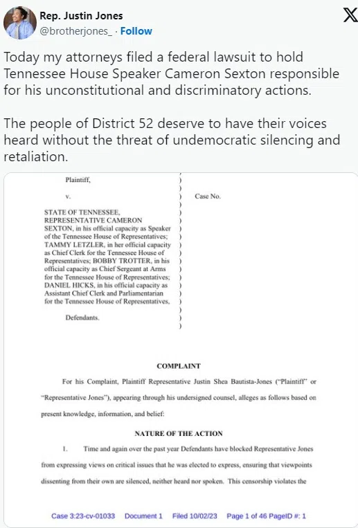 According to Jones’ complaint, filed in the U.S. District Court for the Middle District of Tennessee, the District 52 Representative is seeking a declaratory judgement that his expulsion from the House earlier this year and the House Rules for the 113th General Assembly be ruled “unconstitutional.”