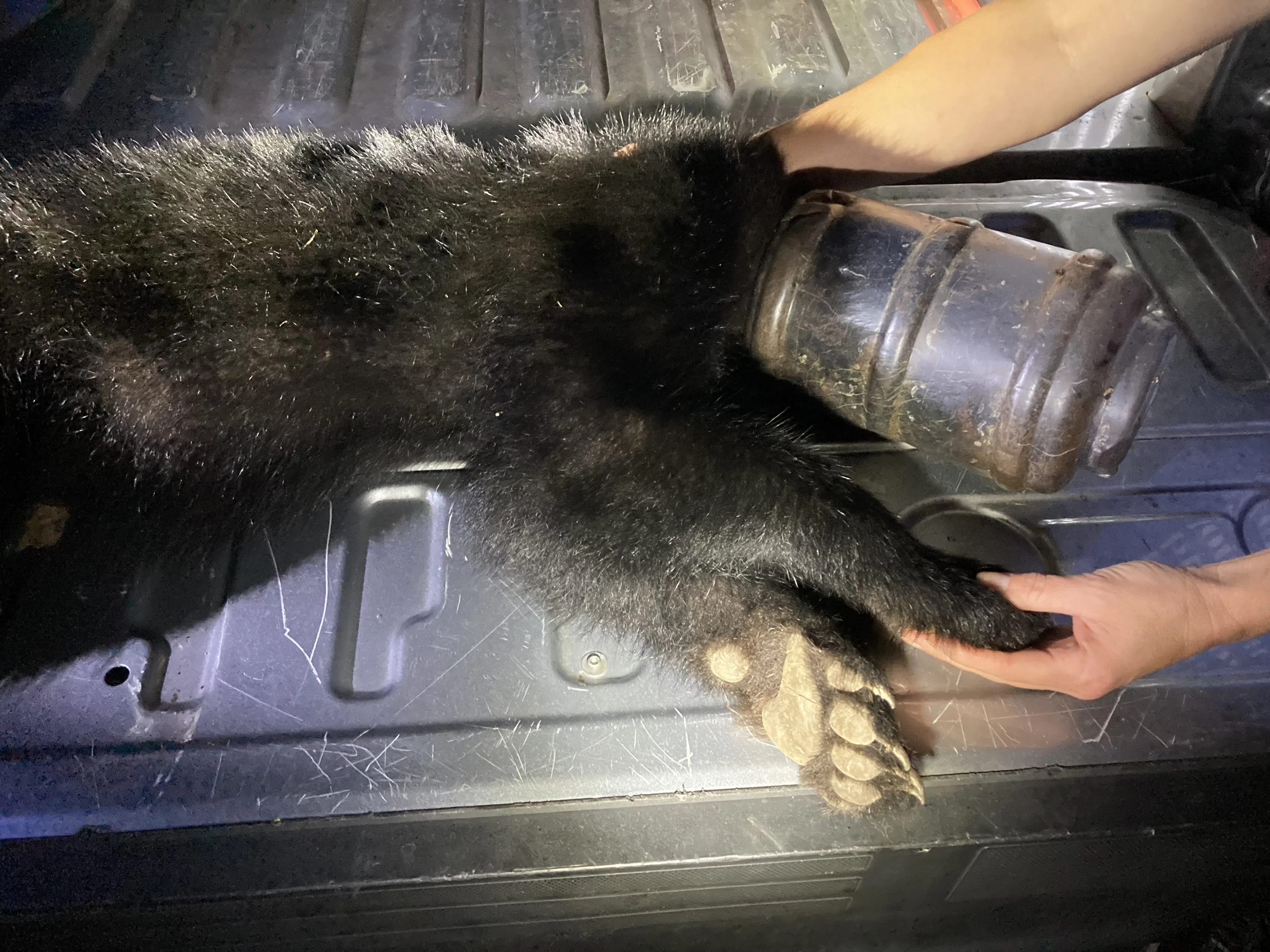 On Tuesday night, a resident who had been following the situation reported that the cub was in a tree and Musser was able to dart the animal and remove the container. She says, “Darting bears in trees is not standard practice and is only done in an emergency. This cub would not be able to continue surviving like this.”