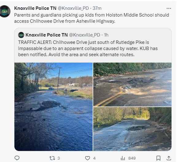 ORIGINAL STORY: A traffic alert is in effect for Chilhowee Drive as a collapse of the roadway is making it impassable for drivers.