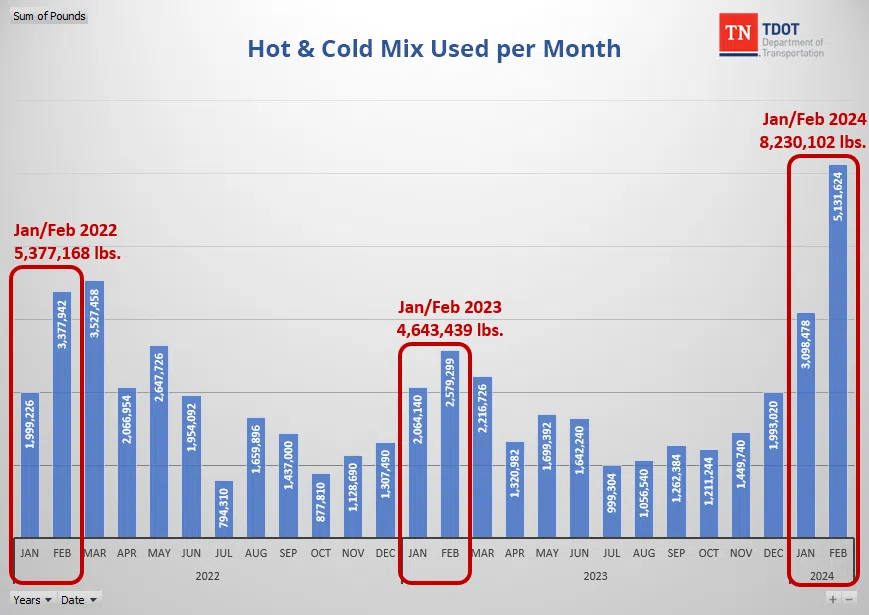 Tennessee Department of Transportation (TDOT) crews continue working around the clock repairing potholes along interstates and state routes caused by January’s record winter storm. The statewide effort is using all available resources, including contract crews, to repair the damaged areas as quickly as possible. TDOT has laid more than double the amount of mix this January and February compared to the same time last year.