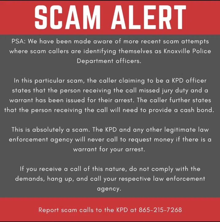 Knoxville Police say they have been made aware of more recent scam attempts where scam callers are identifying themselves as Knoxville Police Department officers.