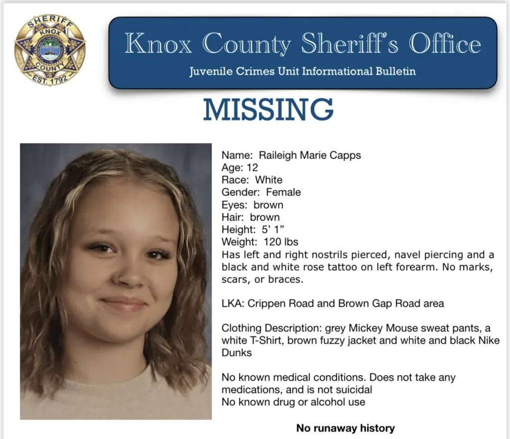 Those with information on the whereabouts of Raileigh Marie Capps are being asked to please call the Knox County Sheriff’s Office at 865-215-2243, 911 or 1-800-TBI-FIND.