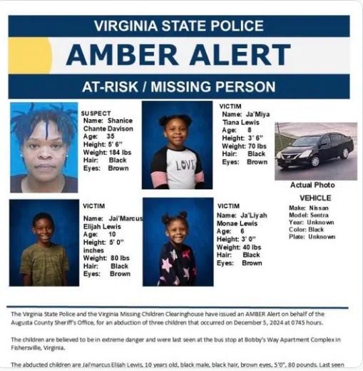 An Amber Alert has been issued for 10-year-old Jai’Marcus Lewis, 8-year-old Ja’Miyah Lewis, and 6-year-old Ja’Liyah Lewis. Authorities say the three children were were kidnapped at an apartment complex in Virginia Thursday morning. The Augusta County Sheriff’s Office says the kidnapping took place at the Bobby’s Way apartment complex in Fishersville.