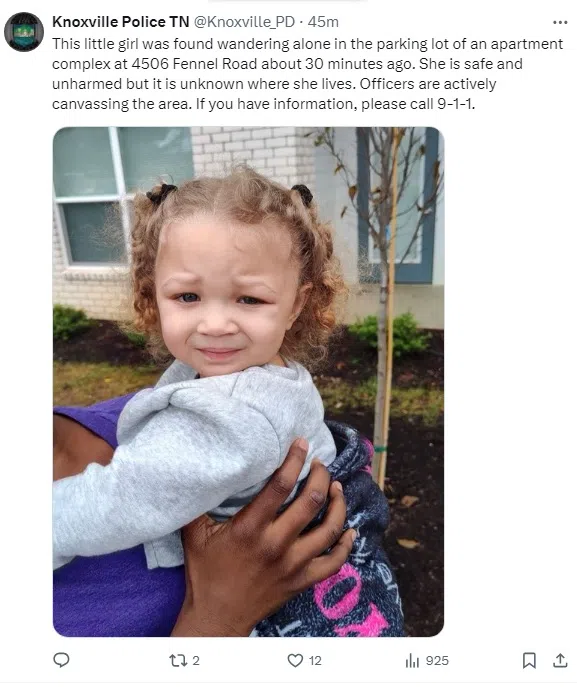 Knoxville, TN (WOKI) The Knoxville Police Department is looking for the parents of a girl officers say was found wandering alone in a parking lot.