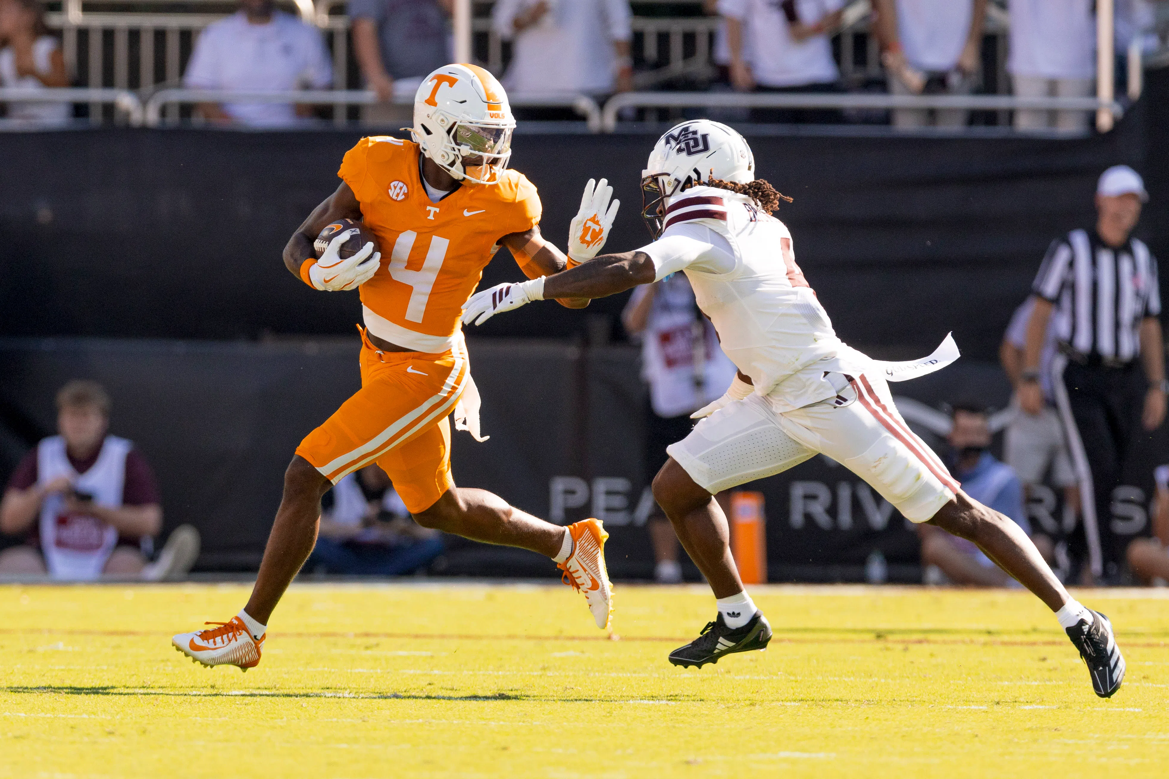 STARKVILLE, MS - September 27, 2025 - Wide receiver Mike Matthews #4 of the Tennessee Volunteers during the game between the Mississippi State Bulldogs and the Tennessee Volunteers at Davis Wade Stadium in Starkville, MS. Photo By Andrew Ferguson/Tennessee Athletics