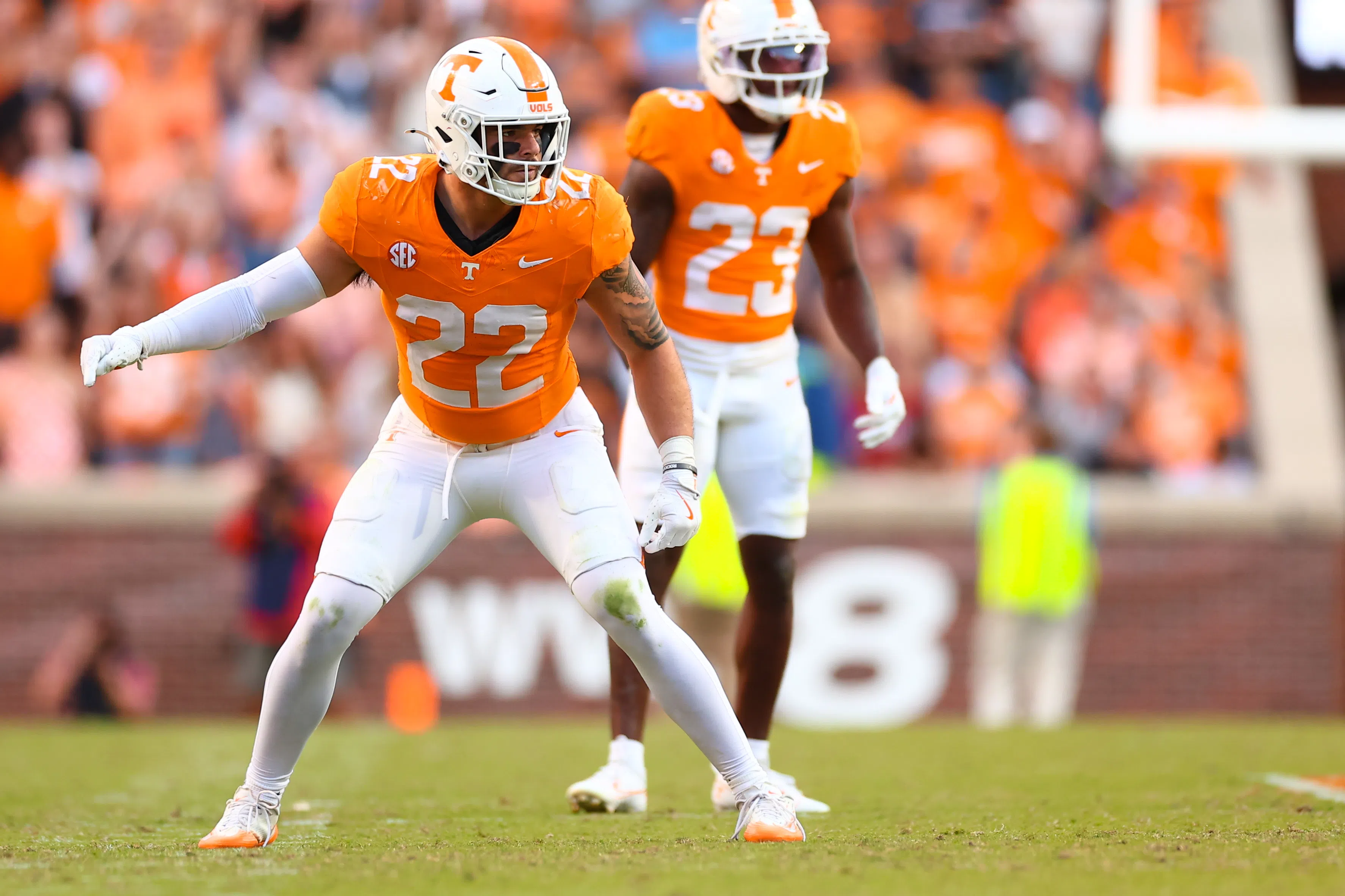 KNOXVILLE, TN - October 11, 2025 - Linebacker Jeremiah Telander #22 of the Tennessee Volunteers during the game between the Arkansas Razorbacks and the Tennessee Volunteers at Neyland Stadium in Knoxville, TN. Photo By Kate Luffman/Tennessee Athletics