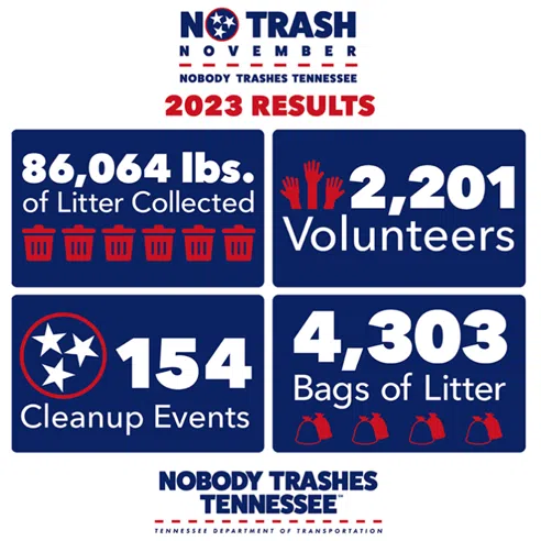 More than 86,000 pounds of litter was removed from communities throughout Tennessee as part of the Tennessee Department of Transportation's https://www.tn.gov/tdot.html (TDOT) 3rd Annual No Trash Nove...