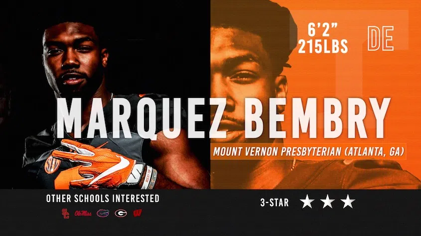 Marquez Bembry DE Atlanta, GA 6’3″ 210 (3-star) Committed 3/17/16 Josh Ward’s Take: Bembry is one of the top athletes in the class. Tennessee’s staff will have to figure out wh...